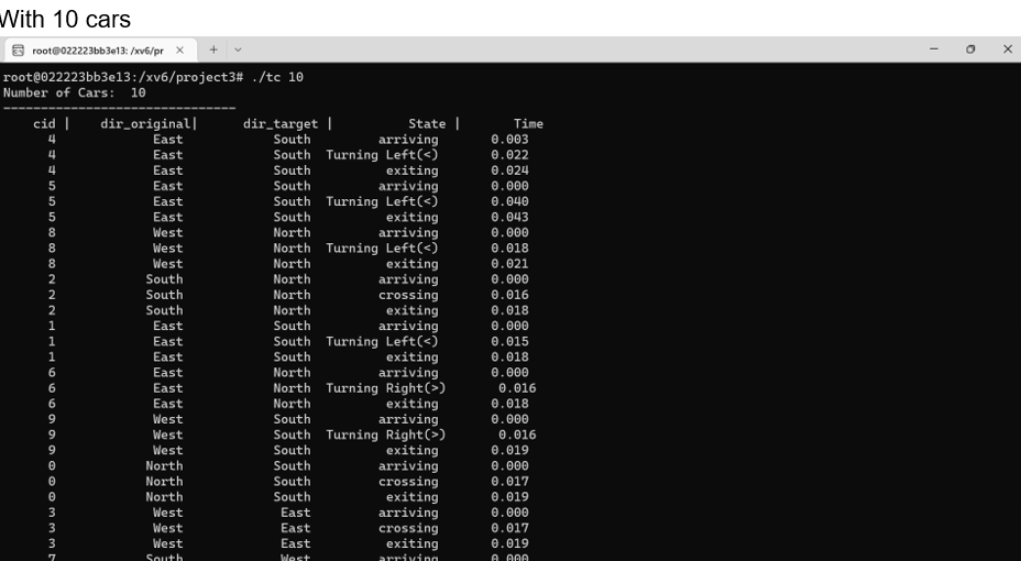The output displays the car ID, the car's original direction, the car's target direction, the actions they perform in order, and the time in double.