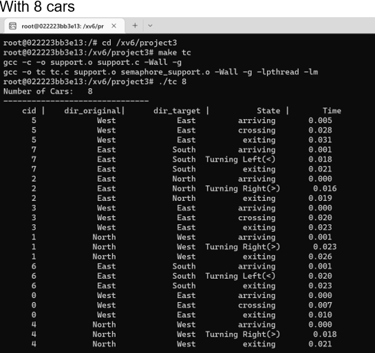 This was implemented in the project through semaphores and pthreads where each car, which can come from any direction, has its own thread.